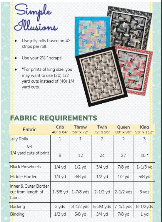 Create a beautiful quilt with this easy-to-follow Simple Illusions pattern, available in five sizes. Perfect for using up fabric scraps, this design works wonderfully with jelly rolls or your own 2-1/2" strips.